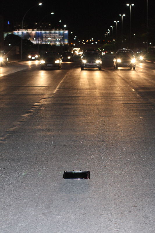 Desta vez o aviso dizia que tudo ocorreria no semáforo mais próximo do museu, supostamente aquele que cuida do entroncamento do Eixo Monumental com a L-2 Sul, próximo à Catedral de Brasília, essa outra sublime criação de Niemeyer. E foi lá mesmo que, uma hora depois do previsto, já noite plena – e com uma grande expectativa do público ciente, que começava a se deslocar do interior da nave para essas coordenadas extramuros – o artista desembarcou no seu Citroën, subindo em cima da calçada, e começou a tirar, de dentro dele, seu novo conjunto de “objetos”: dezesseis garrafões do vinho tinto Sangue de Boi, embalados em plástico bolha. Depois dos abraços em alguns presentes começou a desembalar os garrafões e, uma vez terminado, vestiu um paletó escuro e rumou, com uma bandeja prateada em mãos, para o centro da grande pista do Eixo Monumental. Era o início de tudo.