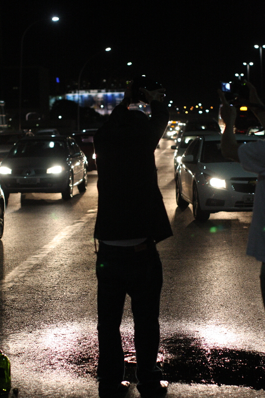 Os carros, ônibus e, a certa altura, também as bicicletas a avançar perigosamente, parece-me que não eram o mero indício – inclusive explicado, pelos fotógrafos que lá estávamos, aos agentes do Detran que lá chegaram, incrédulos, por volta do oitavo ou décimo garrafão, limitando-se educadamente a formar uma barreira com a viatura em que estavam – de que a verdadeira arte tem sempre um componente de risco. Eles eram os elementos perfeitos para situar o que se via num presente, numa atualidade, configurando um contundente acréscimo – e está claro que não de uma maneira imediatista ou óbvia – a tudo o que aqui, nestas paragens, faz jorrar “rios” de “sangue”.