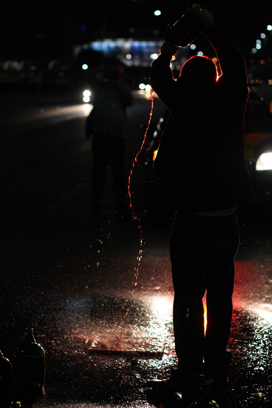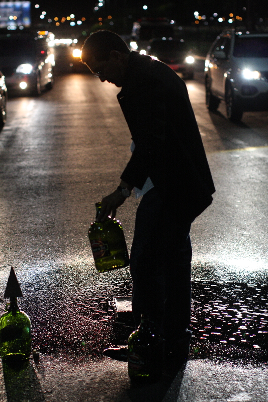 Tal qual quando se fixa num campo de futebol o ponto de onde se chuta o pênalti, a bandeja foi deixada na pista; o sinal abriu, os carros avançaram e, a essa altura, José Eduardo já estava na calçada, pegando o primeiro dos garrafões, cujo conteúdo, em seguida e assim que conseguiu de novo atingir o ponto em que estava a bandeja-agora-alvo, ele começou a despejar em cima do objeto prateado. A situação estava desenhada, os corações de todos, agora, partindo da doce familiaridade proporcionada por tudo o que tinha se apresentado até aquele momento, disparavam ao perceber que o artista, face ao forte fluxo de veículos (era o final de uma sexta-feira), tomava um cuidado mínimo; e que, quando chegava na marca que havia deixado, simplesmente erguia o garrafão e se importava somente de que o que dele jorrava atingisse a bandeja. Nenhum anteparo entre ele e os carros, a não ser o olhar assustado do público, a partir da calçada, que todo motorista atento (mas também só esses) é obrigado a perceber.